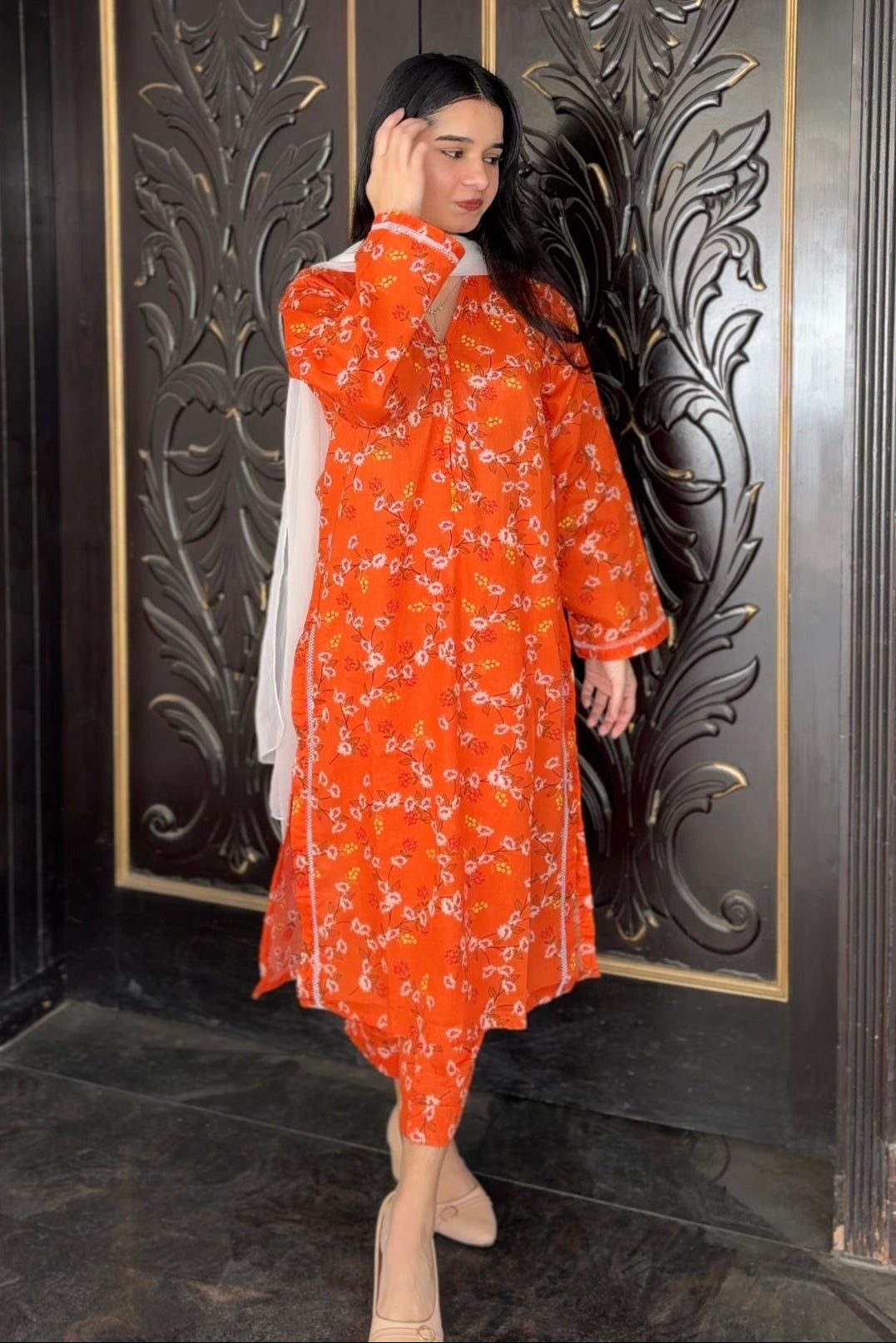 Expertly crafted for women, the 2 pc co ord set - SHERYL, boasts a stunning printed design in versatile ORANGE. This Pret piece combines style and comfort for a flawless look. Elevate your wardrobe with this must-have addition.
